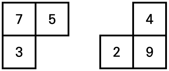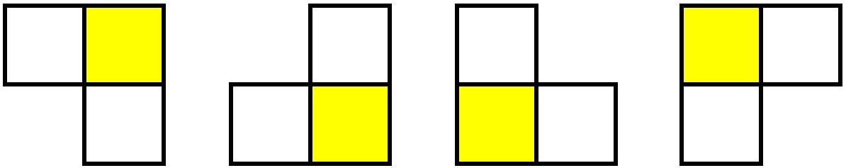 길동이는 이처럼 넓은 사각형 형태의 나무 재료를 잘라서 여러 개의 부메랑을 만들고자 한다. 그리고 부메랑은 항상 3칸을 차지하는 ‘ㄱ’모양으로 만들어야 한다. 따라서 부메랑의 가능한 모양은 다음과 같이 총 4가지다.