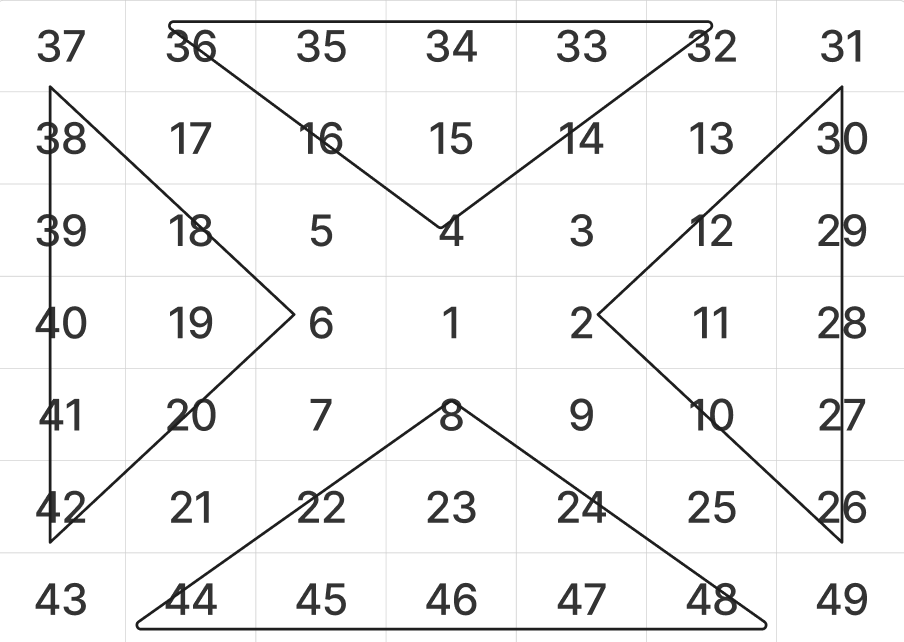 (0,0) 인 1을 기준으로 (-1,-1), (-2,-2), (-3,-3), (-a,-a) 대각선의 규칙을 구하면