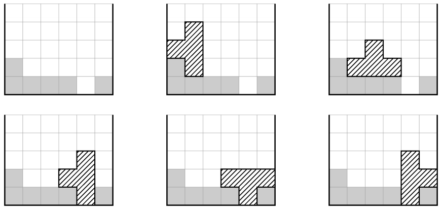 테트리스는 C열 필드위에서 플레이하는 유명한 게임이다. 필드의 행의 수는 무한하다. 한 번 움직일 때, 아래와 같은 일곱가지 블록 중 하나를 필드에 떨어뜨릴 수 있다.