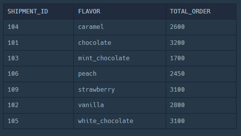 7월 아이스크림 총주문량과 상반기의 아이스크림 총 주문량을 더한 값이 큰 순서대로 상위 3개의 맛을 조회하면 strawberry(520 + 220 + 3,100 = 3,840), mango(790 + 110 + 2,900 = 3,800), chocolate(520 + 3,200 = 3,720) 순입니다. 따라서 SQL 문을 실행하면 다음과 같이 나와야 합니다.