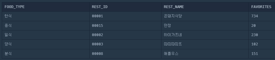 이를 해결하기 위해 서브쿼리는 사용해서 FOOD_TYPE 과 MAX(FAVORIES)를 구해서 결과가 같은 테이블만 불러왔다.